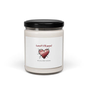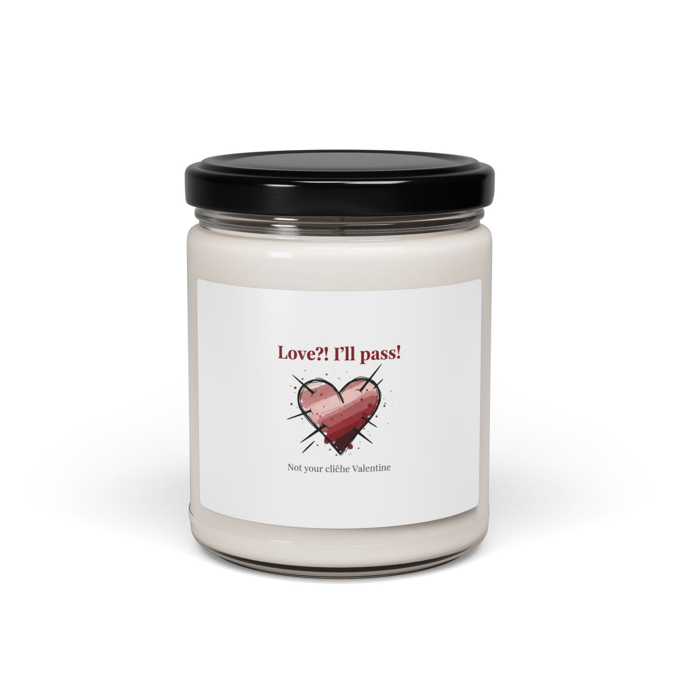 A 9oz soy candle with a tongue-in-cheek heart graphic that flips Valentine tropes into a wry, boundary‑setting statement. The label shows a hand-drawn heart with sketchy linework and a short, sardonic phrase—pairing soft reds/pinks with stark neutral type to read as ‘sweet but guarded.’ Choose from twelve natural scent options to suit an ironically cozy or deliberately detached mood; the reusable glass jar and long burn time make it a low‑fuss addition to a bedside, shelf, or desk where a playful, anti‑Valentine aesthetic is welcome.