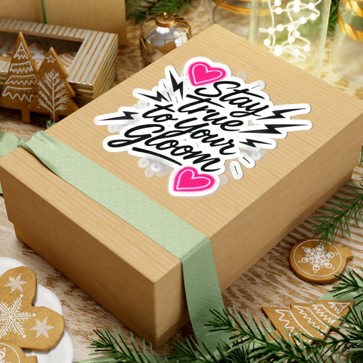 A glossy kiss-cut vinyl sticker that celebrates moody charm with a playful edge. Bold hand-lettering reads “Stay true to your...