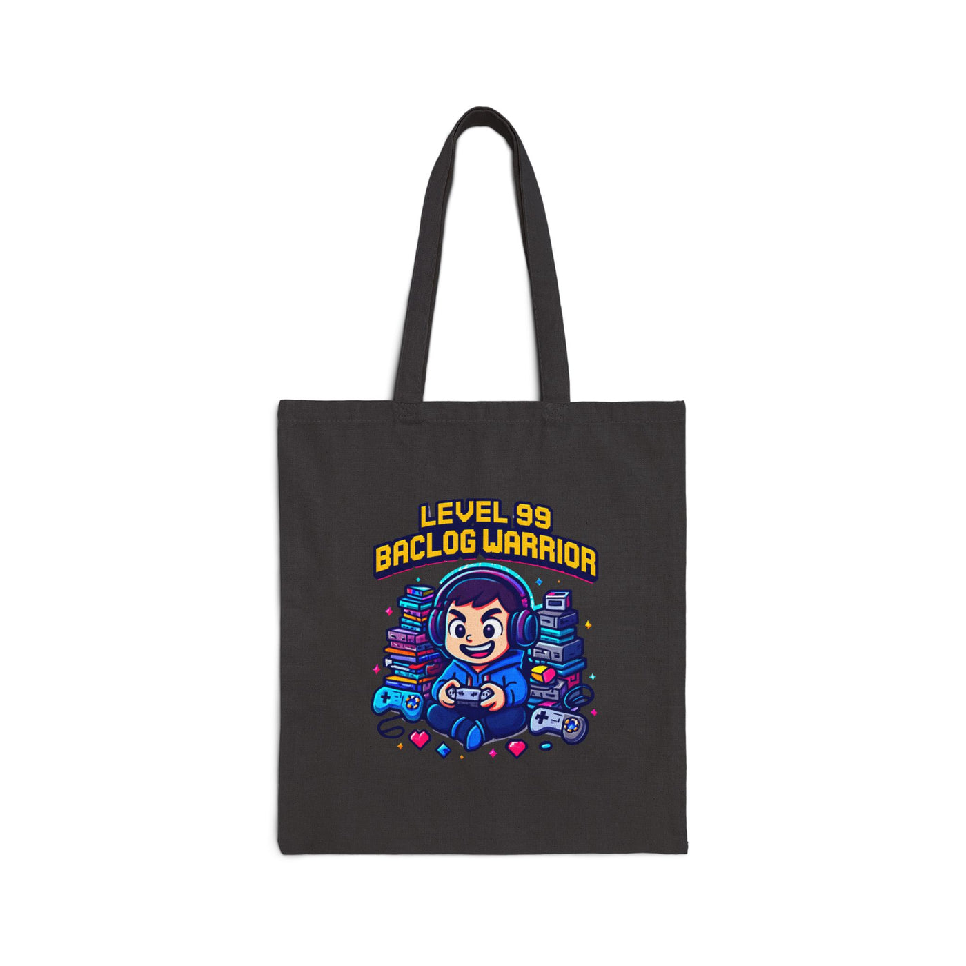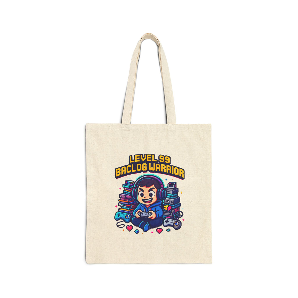 This cotton canvas tote carries a burst of playful energy — a cozy, gamer-ready illustration sits front and center: a smiling player surrounded by stacks of games and controllers, crowned with “LEVEL 99 BACLOG WARRIOR.” The natural heavyweight canvas holds its shape and protects your haul, while long self-fabric handles make it easy to sling over a shoulder for library runs, market days, or conventions. It feels lived-in without losing structure, a wearable nod to late-night quests, thrifted finds, and relaxed weekends spent leveling up. Bring a bit of personality to errands, meetups, or casual hangouts — the artwork sparks smiles and starts conversations wherever it goes.