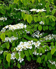 De Viburnum plicatum 'Watanabe' is een compacte, bladverliezende heester die bekendstaat om zijn langdurige en doorlopende bloei. Van het late voorjaar tot in de herfst siert deze Japanse sneeuwbal jouw tuin met stralende, witte bloemschermen. Zijn elegante, gelaagde groei en fraaie herfstkleuren maken hem tot een eyecatcher in elke border of als solitair.