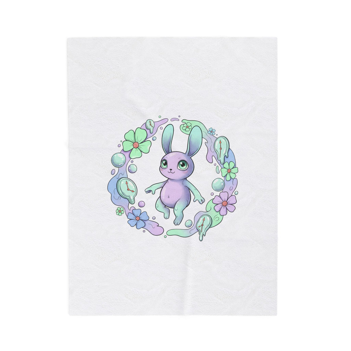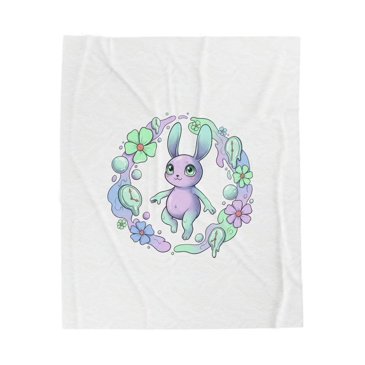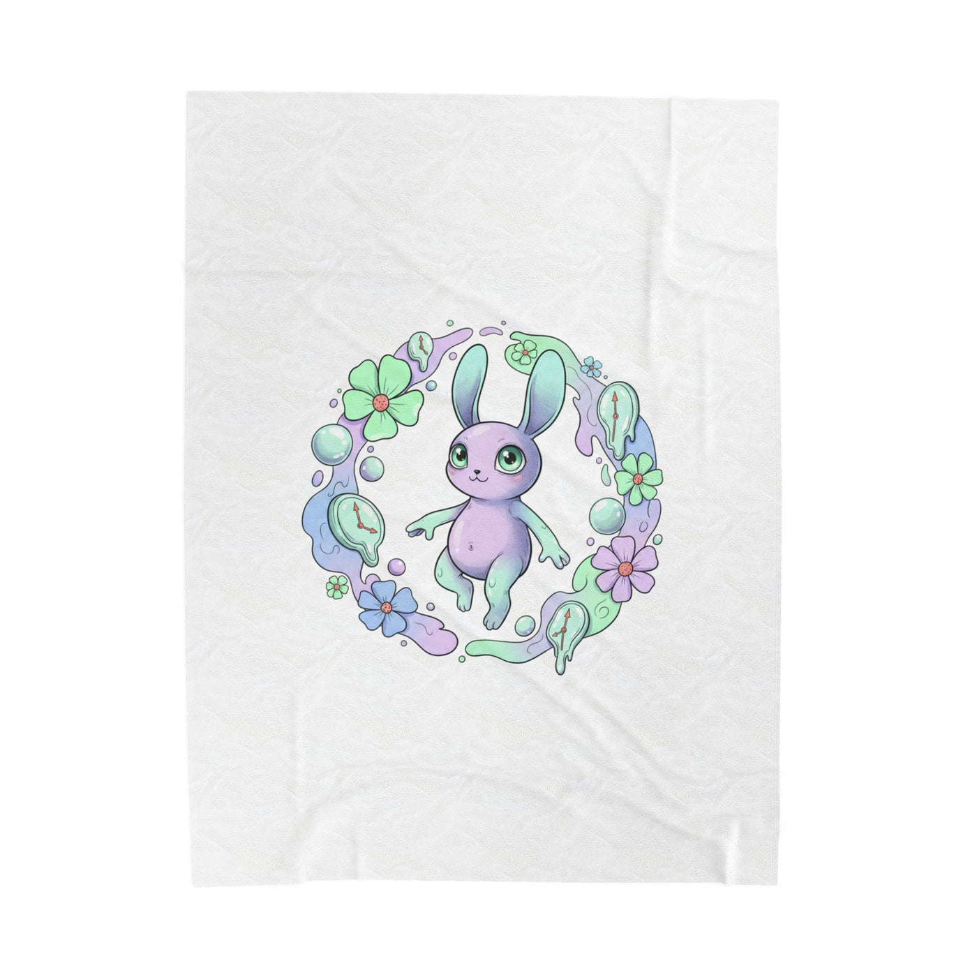 A soft, slightly absurd velveteen blanket featuring a pastel micro-surreal illustration: a wide-eyed, lavender bunny-like creature floats inside a wreath of quirky teardrop shapes and simple flowers. The artwork leans into weirdcore’s playful oddness with muted mints, lilacs, and creams, making the image feel whimsical and internet-native while keeping typography minimal so the imagery reads instantly in thumbnails. Lightweight yet plush, the print-centered composition is suited to cozying up during late-night scrolling or adding a weird, soft accent to a dorm, studio, or nook where indie art collectors gather.