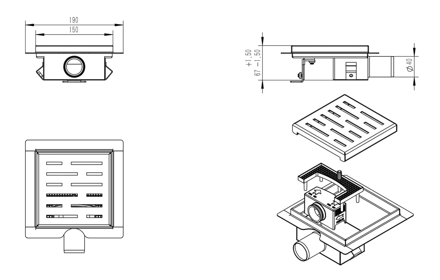 Wiesbaden Mat Zwart 15x15 cm Douchegoot met Flens en Zijuitlaat