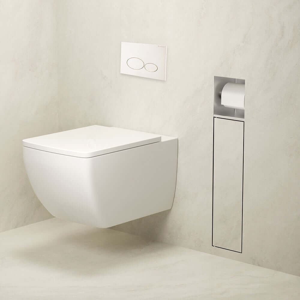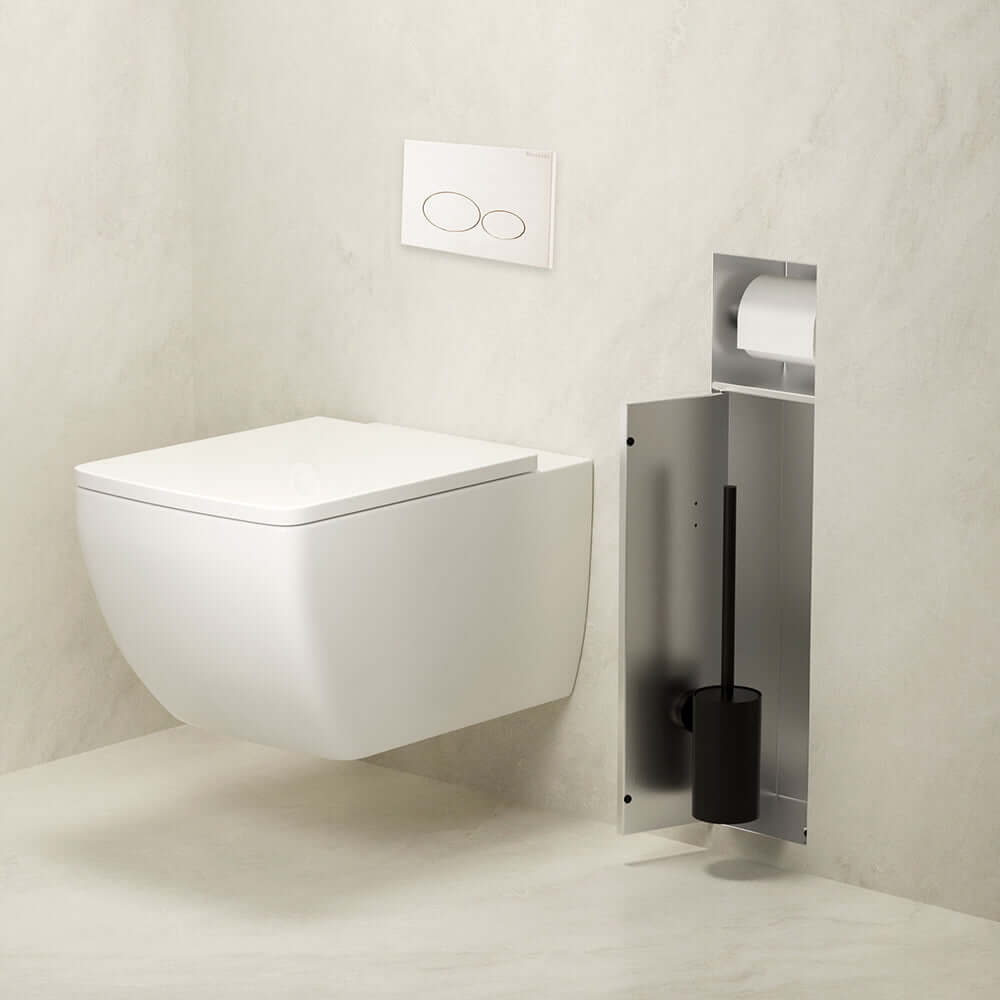 Deze opvallende gentegreerde toiletrolhouder biedt alle benodigdheden voor uw toiletbezoek. De houder bevat naast een toiletrolhouder ook een vak voor een toiletborstel. Deze methode maakt discrete opslag mogelijk, waardoor een schone en hyginische toiletomgeving behouden blijft. De betegelbare deur van de toiletrolhouder maakt een naadloze integratie in de esthetiek van uw badkamer mogelijk, waardoor de toiletrol- en borstelhouder bijna onmerkbaar tegen de muur staan.
