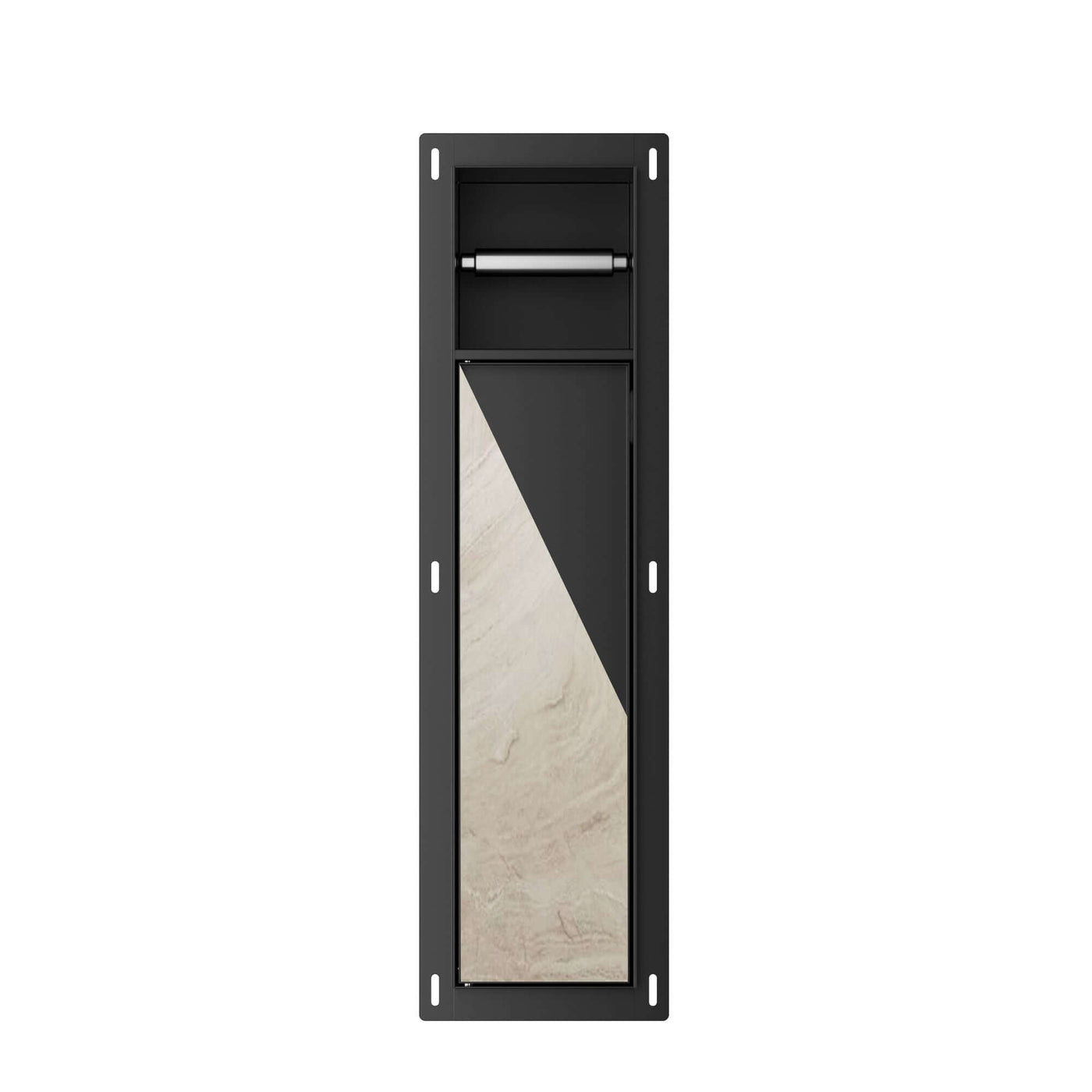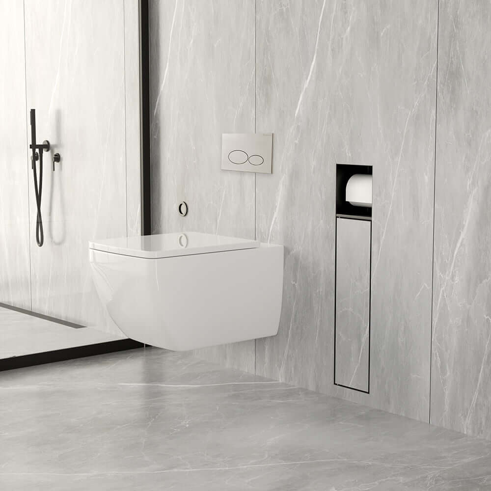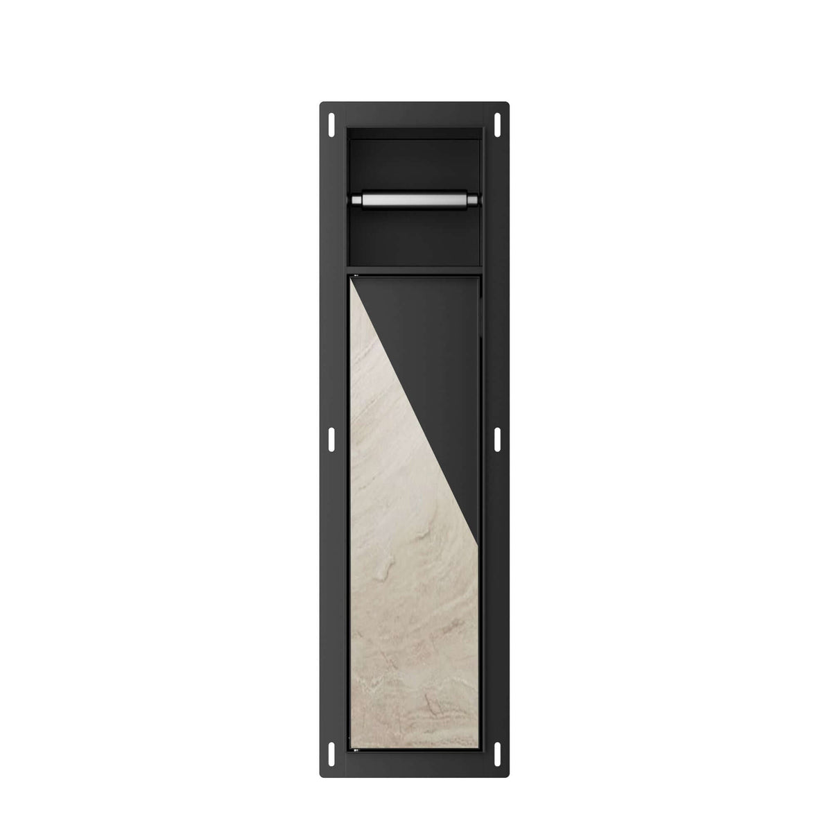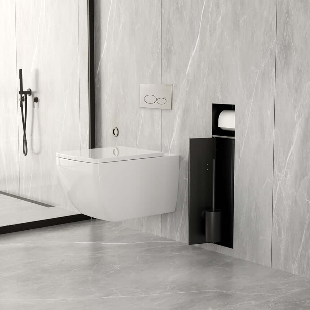 Deze opvallende gentegreerde toiletrolhouder biedt alle benodigdheden voor uw toiletbezoek. In de houder zit een vak voor zowel een toiletrol als een toiletborstel. Deze methode maakt discrete opslag mogelijk, waardoor uw badkamer netjes en hyginisch blijft. De betegelbare deur van de toiletrolhouder maakt een naadloze integratie met de esthetiek van uw badkamer mogelijk, waardoor de toiletrol- en borstelhouder bijna onmerkbaar tegen de muur staan.